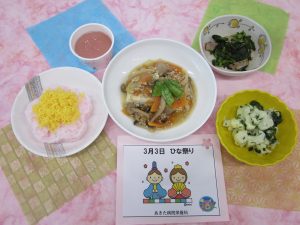 よって当院のデイサービスは日曜日お休みなので実施できません。しかし別な形でデイサービスもお祝いしました。(写真)季節が早く進むようで桃の花も散ってしまいましたが、楽しい・美味しいひなまつりとなったようです。