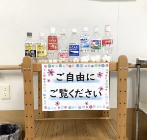 栄養科では来院される方にみていただけるよう、正面玄関入って右手側にペットボトルに含まれる砂糖の量を角砂糖で表したものを展示しています。