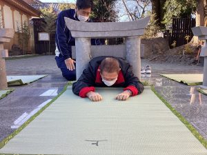 粟島神社名物のミニ鳥居に利用者さん、職員が挑戦し、よき思い出となりました。