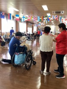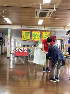 両団代表の選手宣誓から始まり、棒を使っての物送りゲームやお手玉を的に向かって投げ入れるお手玉入れなど、利用者さんも職員も全力で参加しました。