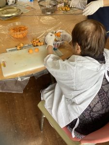 収穫は職員が行い、利用者さんには皮をむき、半分に切って種を取っていただきました。