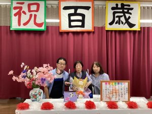 8月8日(金)、石崎さんの百歳のお誕生日会を催しました。ご家族にも参加していただき、利用者さん、スタッフでお祝いをいたしました。