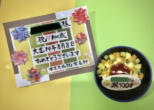 8月8日 金曜日、i様の100歳のお誕生日会をデイサービスにて行いました。