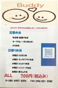 2025/09/29 お知らせ キッチンカー新規出店のお知らせ 【Buddy】さん 定期的に楽しんでいただいているキッチンカーの出店ですが、 10月より新たに お弁当&スーツ販売の「Buddy」さんが仲間入りしました! 場所はあきた病院 東側駐車場 時間は11:30~13:00頃(時間は前後します) 是非ご賞味ください。 白藤方面からお越しの場合、正面駐車場より手前に東側駐車場があります。